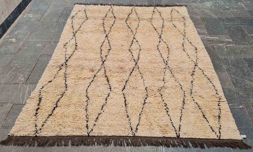 در گذشته، فرش های مراکشی بیشتر به عنوان روانداز مورد استفاده قرار می گرفتند و به همین دلیل بافتی بسیار نرم و لطیف داشتند. نخ به کار رفته در بافت این فرش ها از پشم گوسفندی است که کیفیت و طول عمر بسیار بالایی دارد. رنگ های طبیعی پشم باعث می شود این فرش ها بیشتر با رنگ های سفید، کرم، سیاه، خاکستری و قهوه ای دیده شوند.